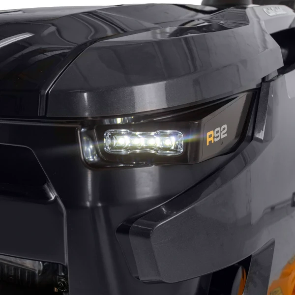 Le changement majeur de 2026 est l'adoption massive d'un gris anthracite profond sur le capot et les châssis, transformant la tondeuse en un objet de prestige industriel. Le jaune historique devient une signature dynamique, créant un contraste électrique qui souligne les points de puissance de la machine. Cette identité visuelle est complétée par une barre LED ultra-fine intégrée sur les modèles Zero Turn ou de phares LED incisifs sur la série Force, offrant un regard technologique et une visibilité nocturne décuplée. L'aspect robuste est enfin scellé par des finitions noir mat texturées et des logos en relief, imposant une aura de durabilité dès le premier coup d'œil.