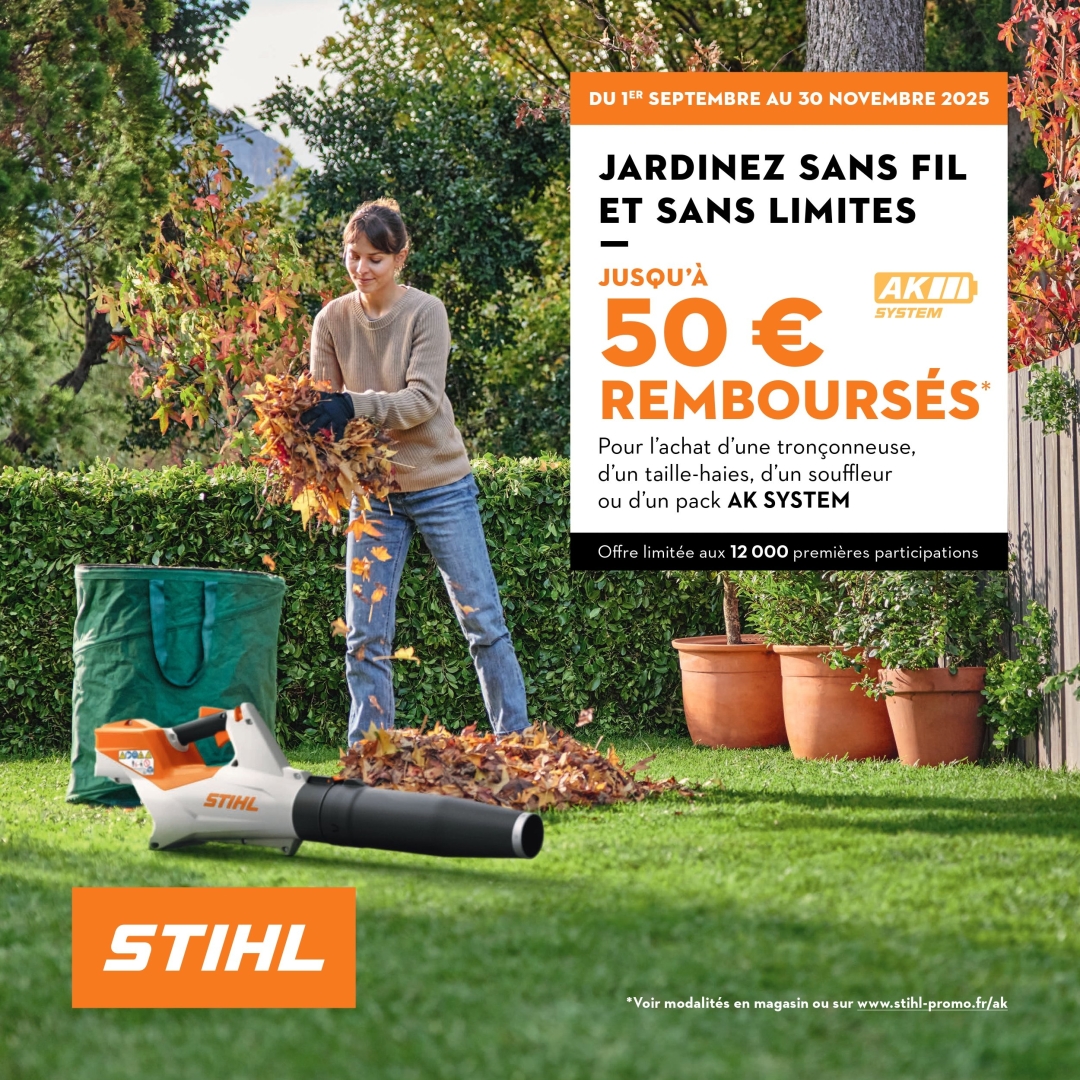 Du 01 Septembre au 30 Novembre 2025, profitez de 30 € ou 50€ remboursés pour tout achat d’une tronçonneuse, taille-haies, perche d'élagage ou souffleur à batterie nu (produit seul) ou d’un pack (produit + batterie + chargeur ou produit + set de démarrage AK) de la gamme STIHL AK SYSTEM (sélection de produits). Offre réservée aux particuliers domiciliés en France. Une seule participation par foyer (même nom, même adresse et/ou RIB) est autorisée.