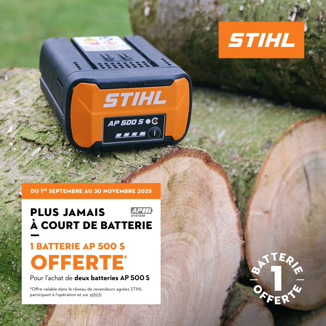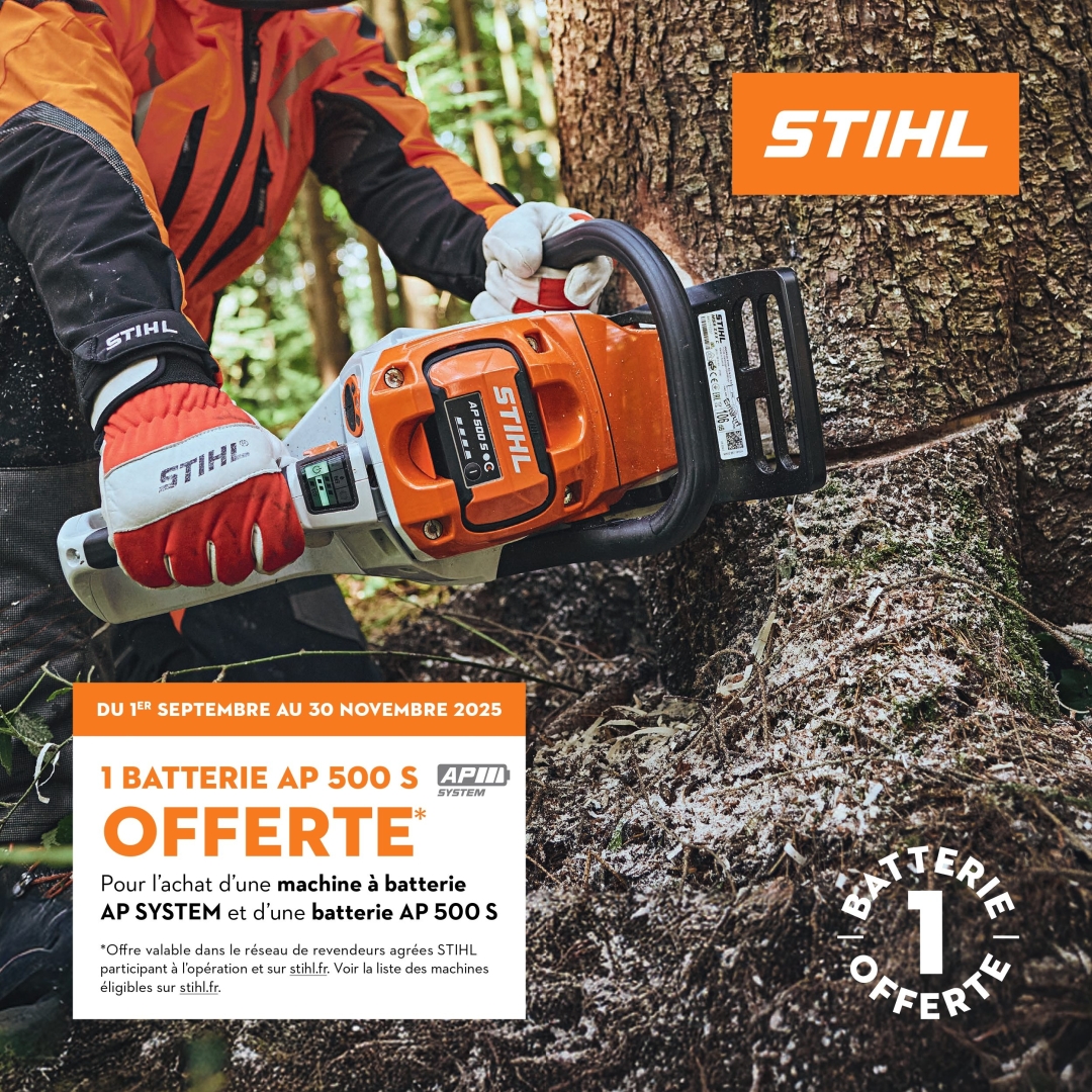 OFFRE 1 : Du 01 septembre au 30 novembre 2025 inclus, pour l'achat simultané d'une batterie STIHL AP 500 S et d'une machine STIHL AP SYSTEM parmi une sélection (voir ci-dessous), bénéficiez d'une seconde batterie AP 500 S offerte.