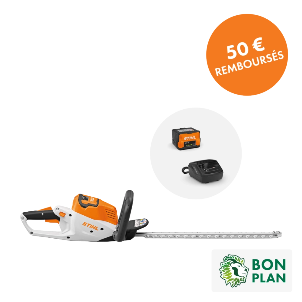 OFFRE DE REMBOURSEMENT STIHL : 50€ remboursés par STIHL pour l’achat de ce pack machine AK (machine, batterie et chargeur). Offre valable du 1er septembre 2025 au 30 novembre 2025 dans la limite des participations restantes. Conditions complètes disponibles sur stihl-promo.fr