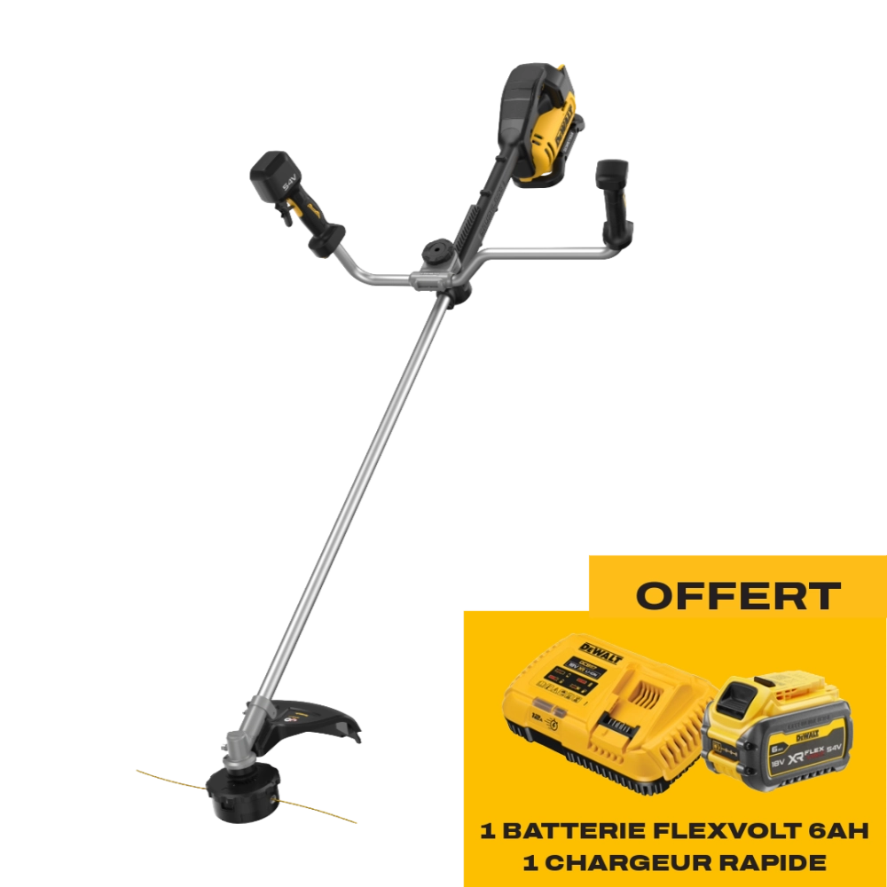 La débroussailleuse à batterie DEWALT DCMST922N-XJ fait partie de la gamme XR FLEXVOLT 54 V, reconnue pour sa puissance et sa fiabilité. Grâce à son moteur BRUSHLESS haute performance, elle offre une autonomie pouvant atteindre 63 minutes (avec batterie 54 V 15 Ah, non incluse), tout en garantissant une coupe nette et régulière. Sa largeur de coupe de 42 cm permet un travail rapide et efficace, idéale pour entretenir de vastes zones herbeuses ou éliminer des broussailles épaisses. Cette machine combine ainsi les avantages d’une débroussailleuse thermique avec la praticité du sans-fil.