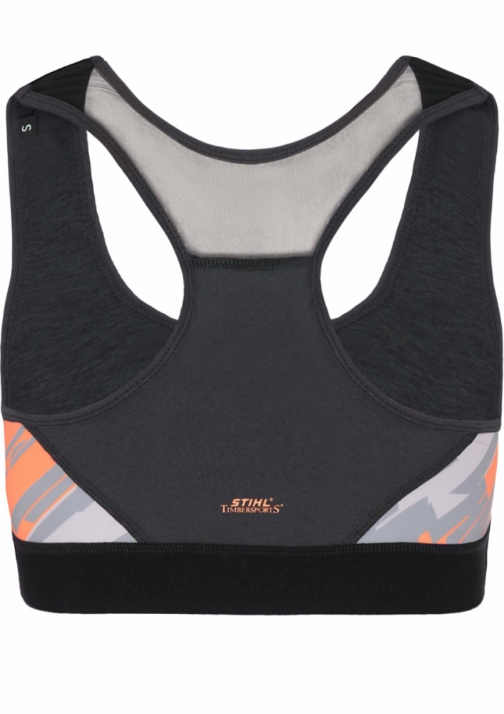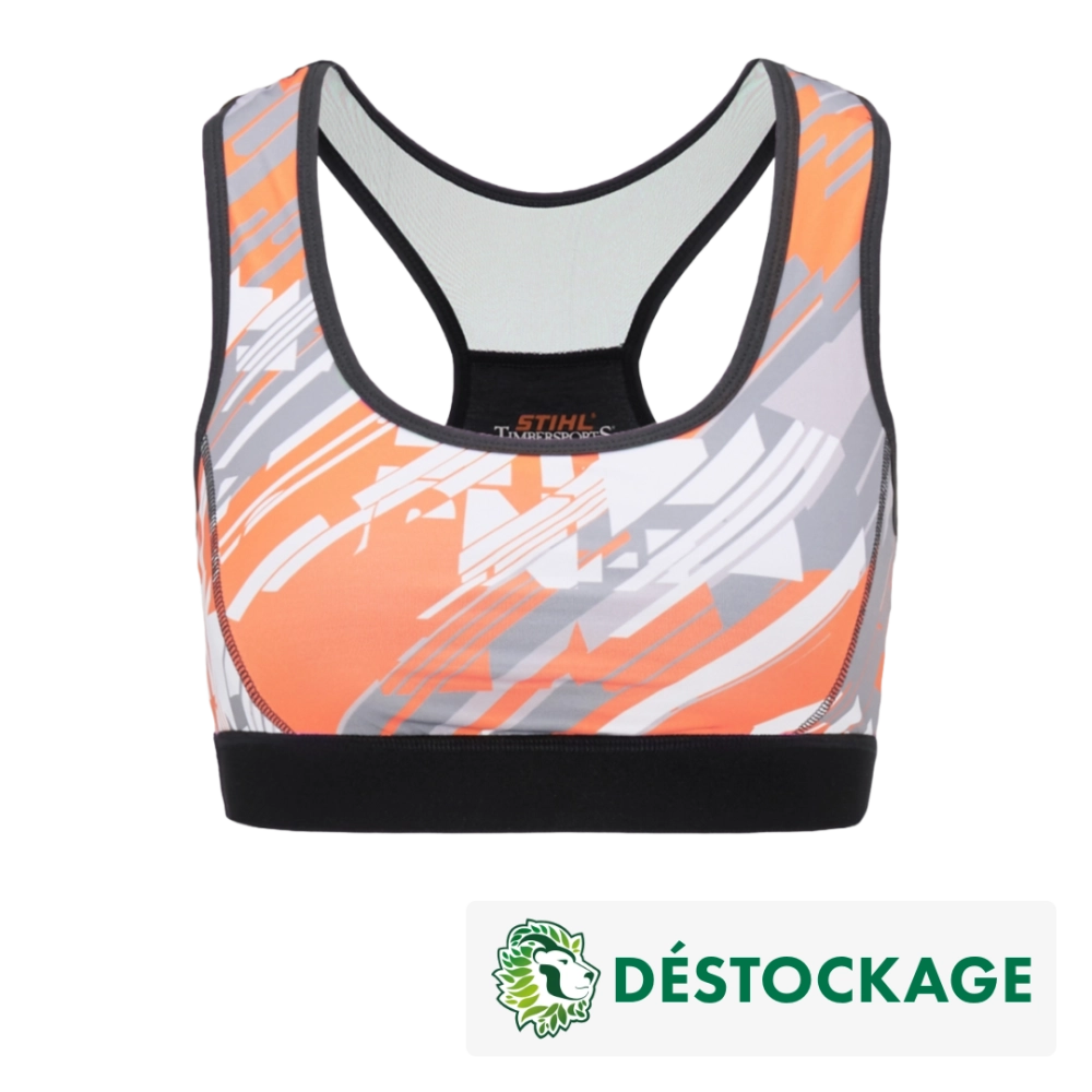 Yoga ou autres entraînements? Aucun problème avec le bustier de sport ! Le mélange de matériaux 86% polyester et 14% élasthanne assure non seulement une bonne tenue, mais est également à séchage rapide et respirant. L'imprimé all-over en gris, orange et blanc avec une large élastique sous-poitrine fait du bustier de sport un véritable accroche-regard !