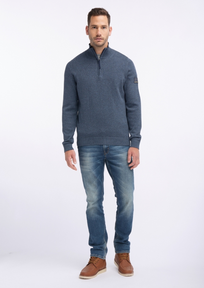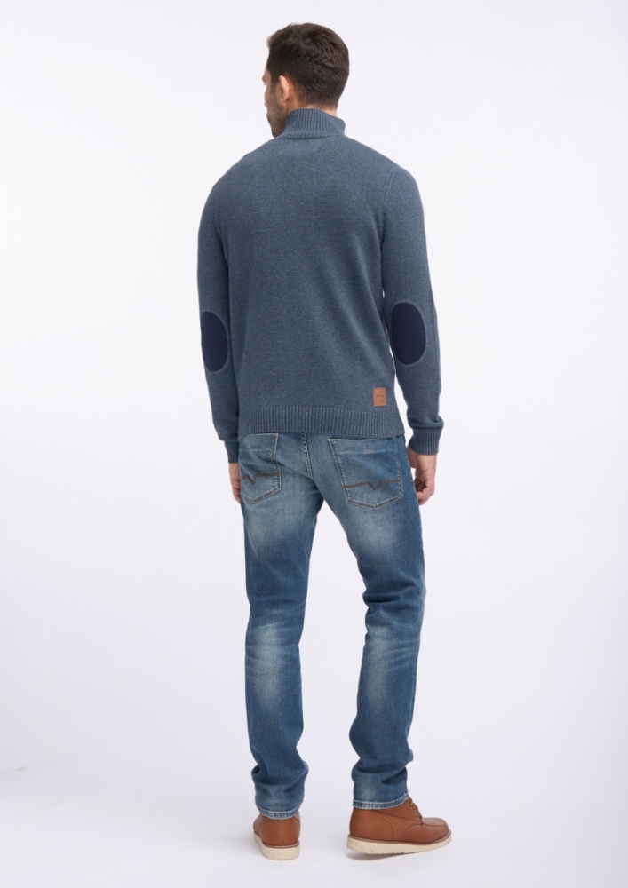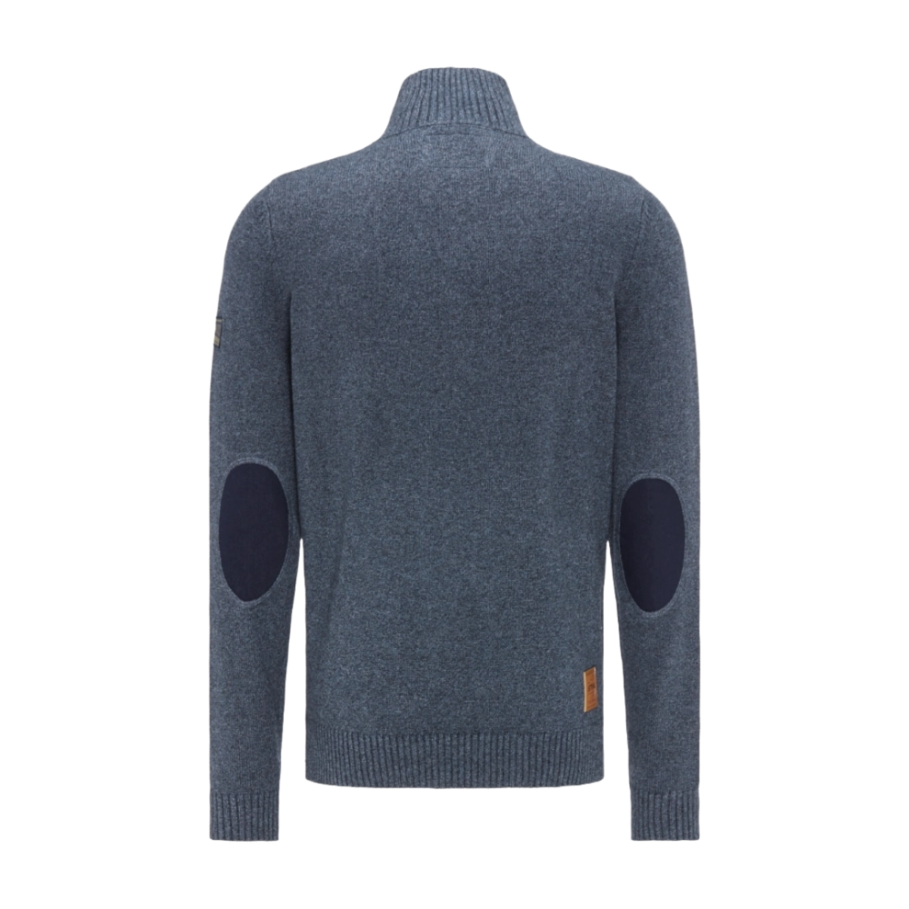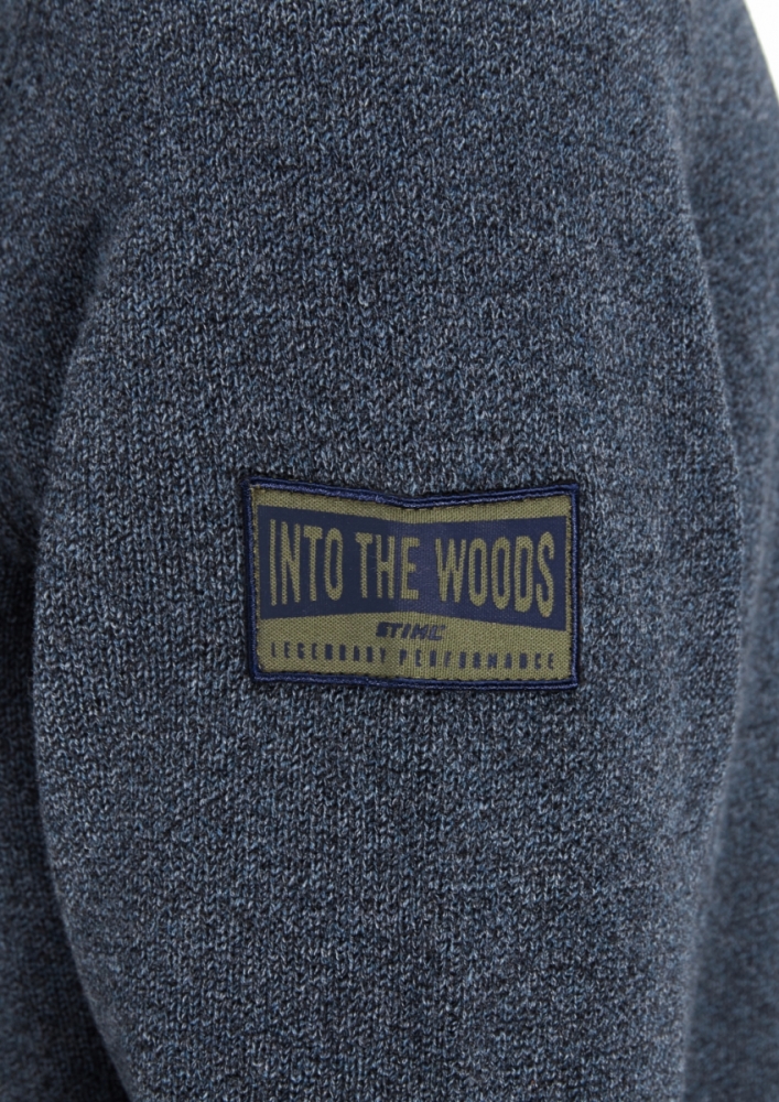 Pull STIHL en maille bleu foncé en 100% coton avec col montant et zip. Les patchs classiques aux coudes et le badge "INTO THE WOODS" sur le haut du bras gauche complètent la coupe intemporelle.