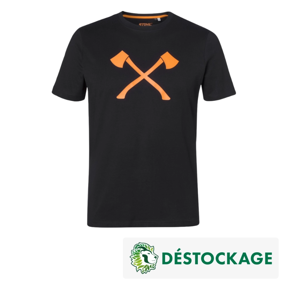 Un véritable accroche-regard est le t-shirt noir à col rond en 100% coton pour un confort de port élevé, avec des axes orange vif comme impression sur le devant et le logo STIHL TIMBERSPORTS® dans le dos. Le bon maillot pour encourager à chaque championnat!