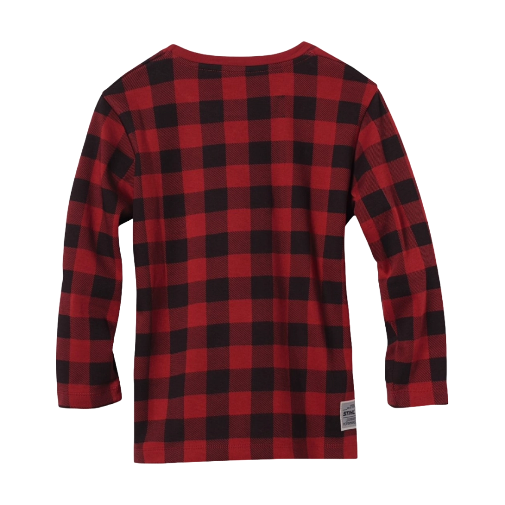 Le t-shirt à manches longues pour fille au design tendance carreaux avec des patchs amusants avec des personnages de dessins animés allant des tronçonneuses aux castors STIHL sont tout aussi spéciaux que l'application typique "PERFOMANCE LÉGENDAIRE" au dos.