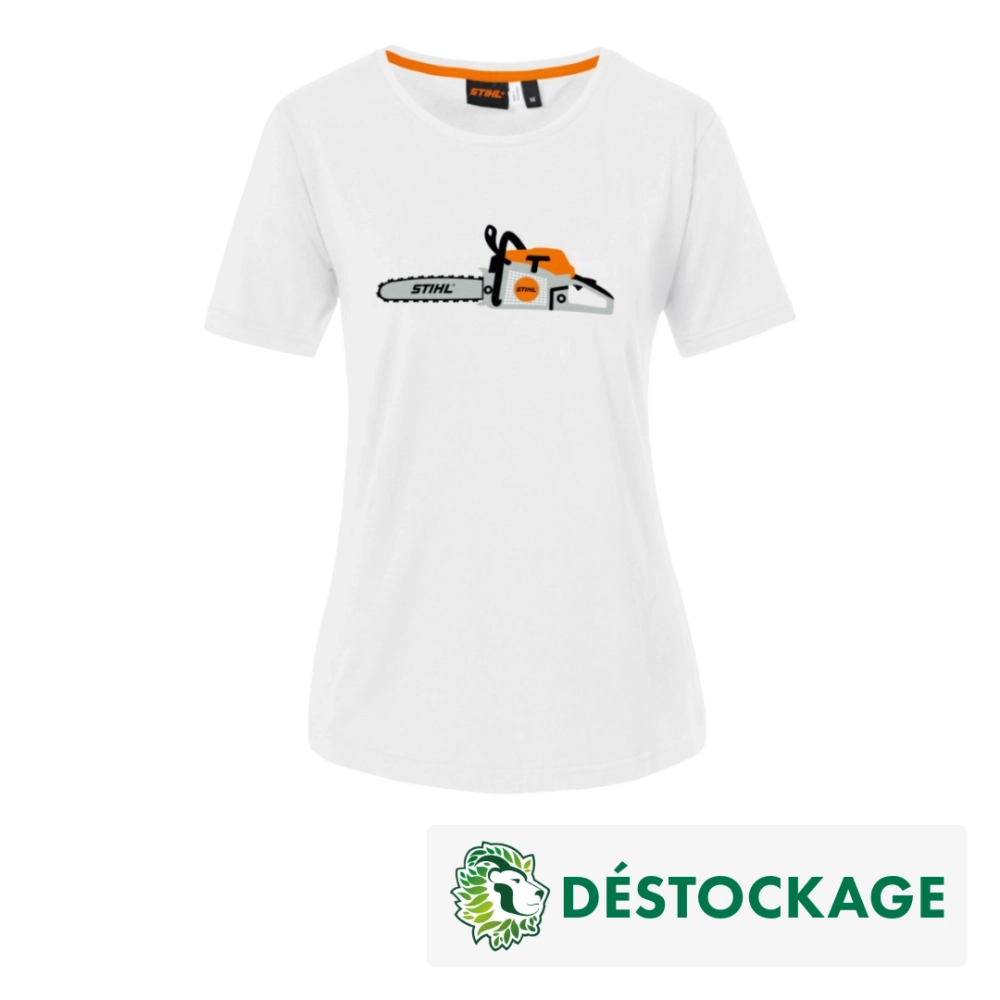 Design fort pour les femmes : ce t-Shirt STIHL en mélange de coton doux avec 5% d'élasthanne s'adapte parfaitement à la silhouette tout en restant lâche et décontractée. L'imprimé coloré sur la poitrine avec la tronçonneuse est un véritable accroche-regard !