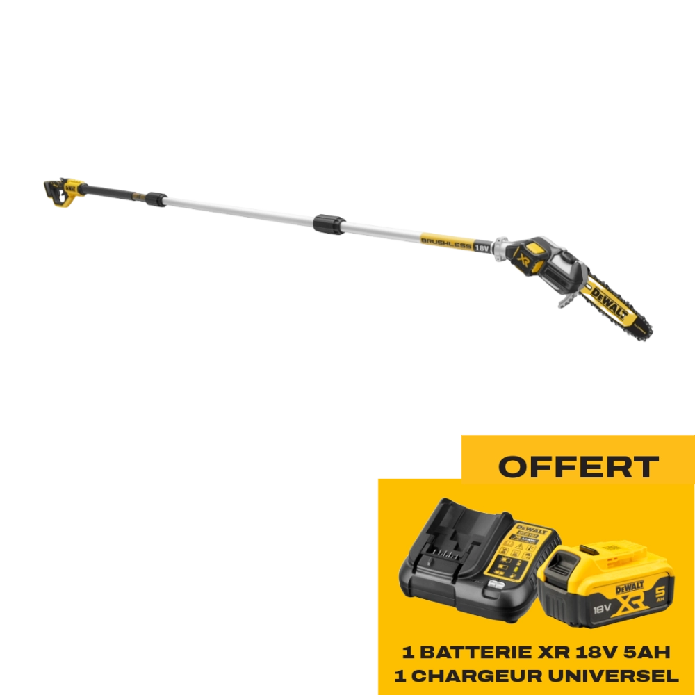 L'élagueuse sur perche DEWALT DCMPS567 est un outil sans fil de la gamme XR 18V, conçu pour faciliter les travaux d'élagage en hauteur. Grâce à ses tubes télescopiques, elle offre une portée maximale de 4,5 mètres, permettant d'atteindre aisément les branches élevées sans nécessiter d'échelle. Sa tête inclinée assure un meilleur contrôle lors de la coupe, rendant les opérations plus précises et sécurisées.