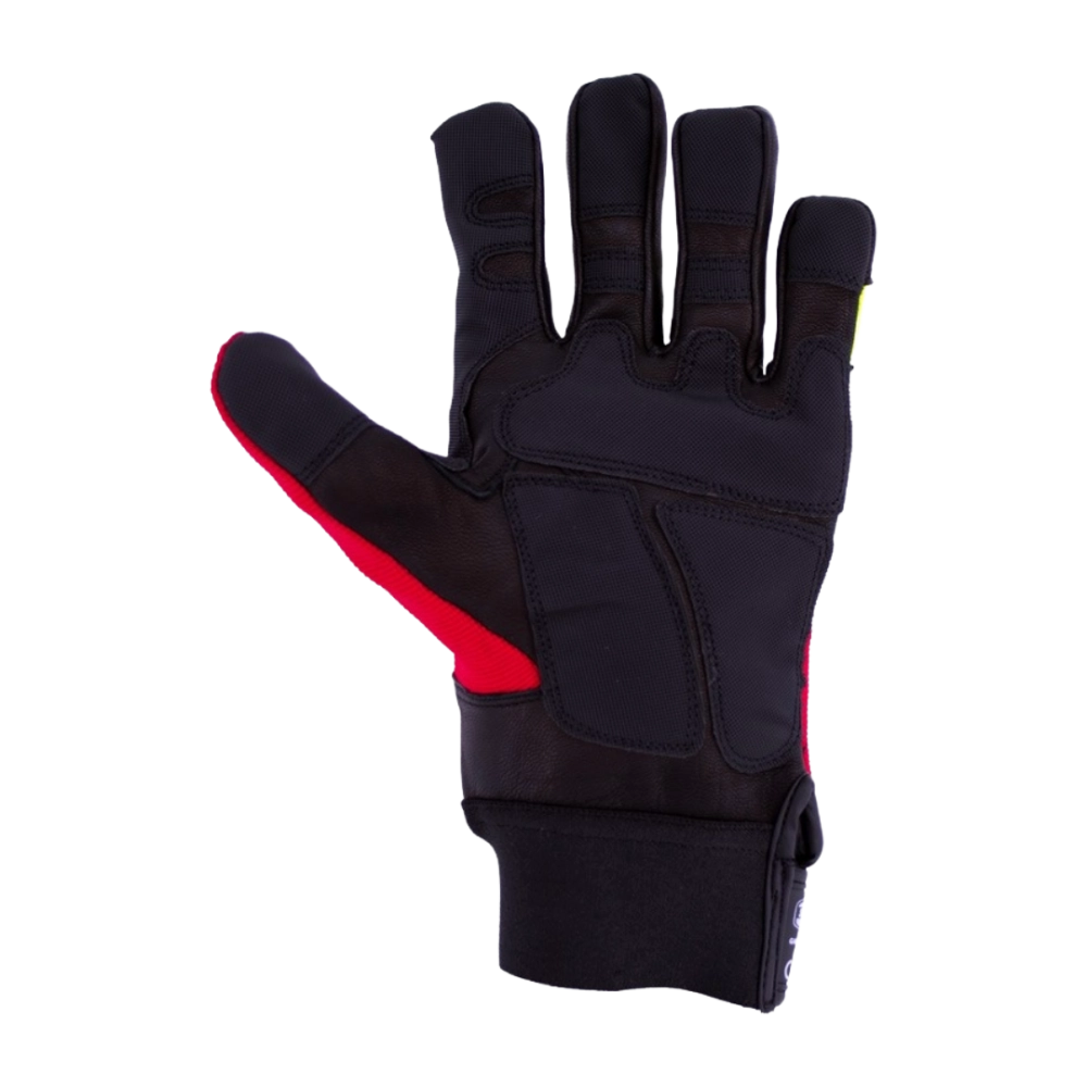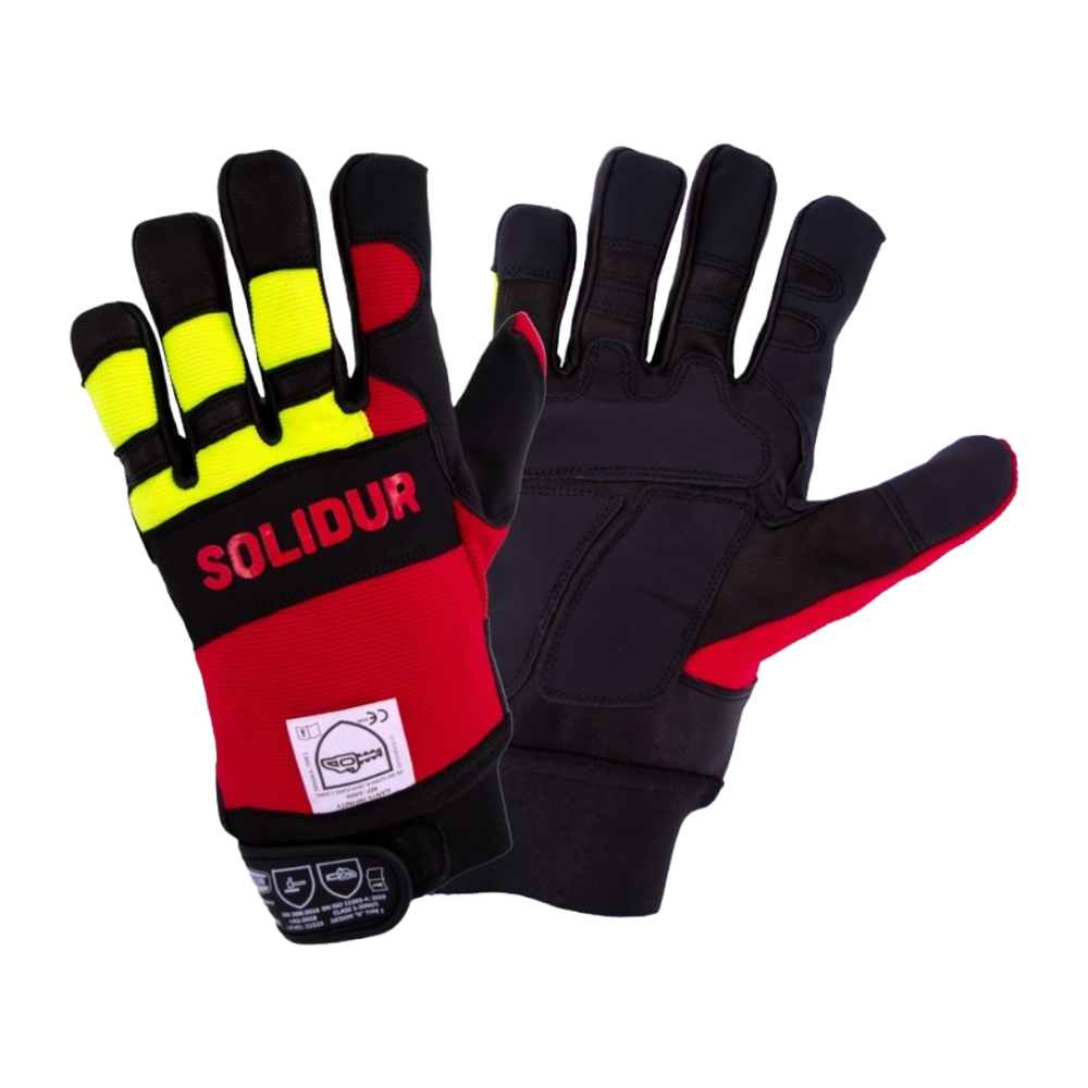 Dos en polyester extensible rouge/jaune haute visibilité, fermeture auto-agrippante, ajustement sécurisé font partie des points forts de ces gants profitant du savoir-faire SOLIDUR et d'une excellente qualité de fabrication.