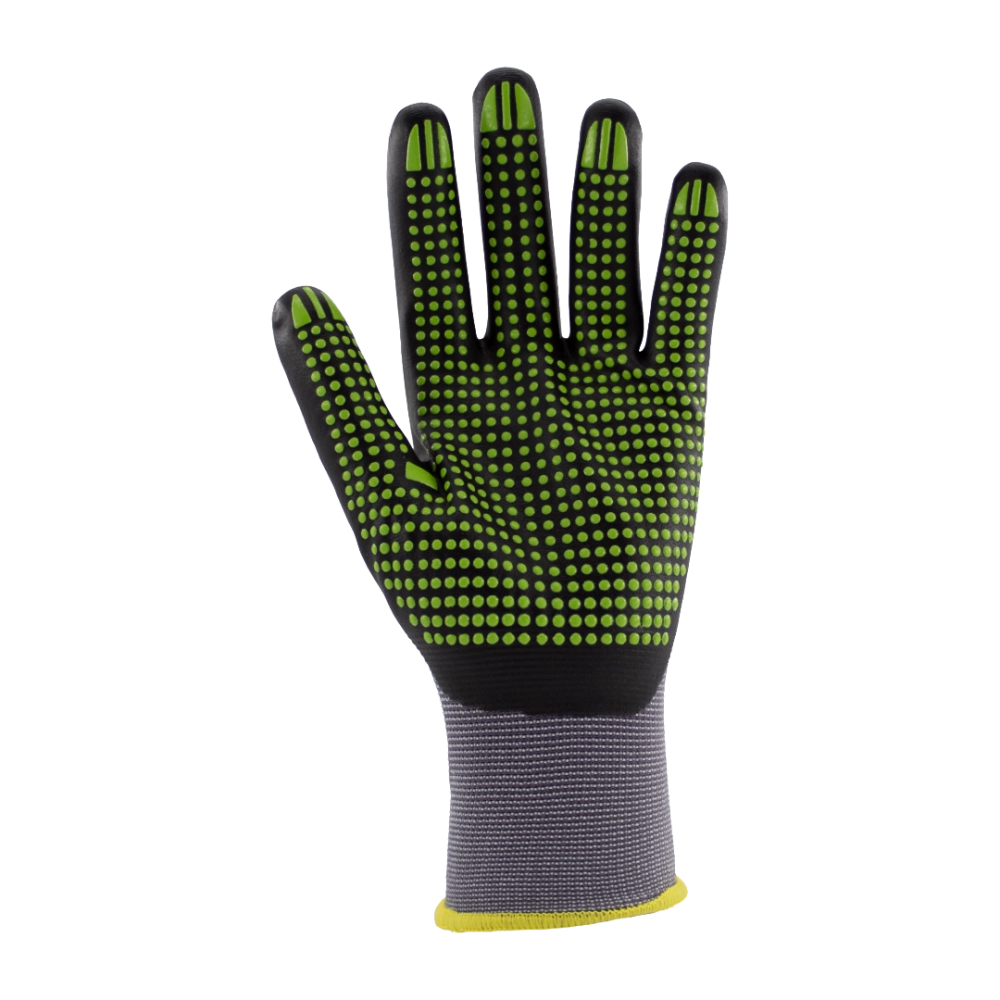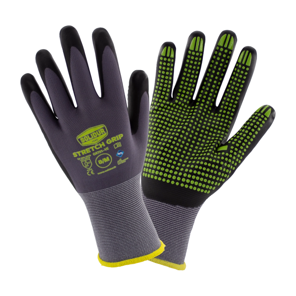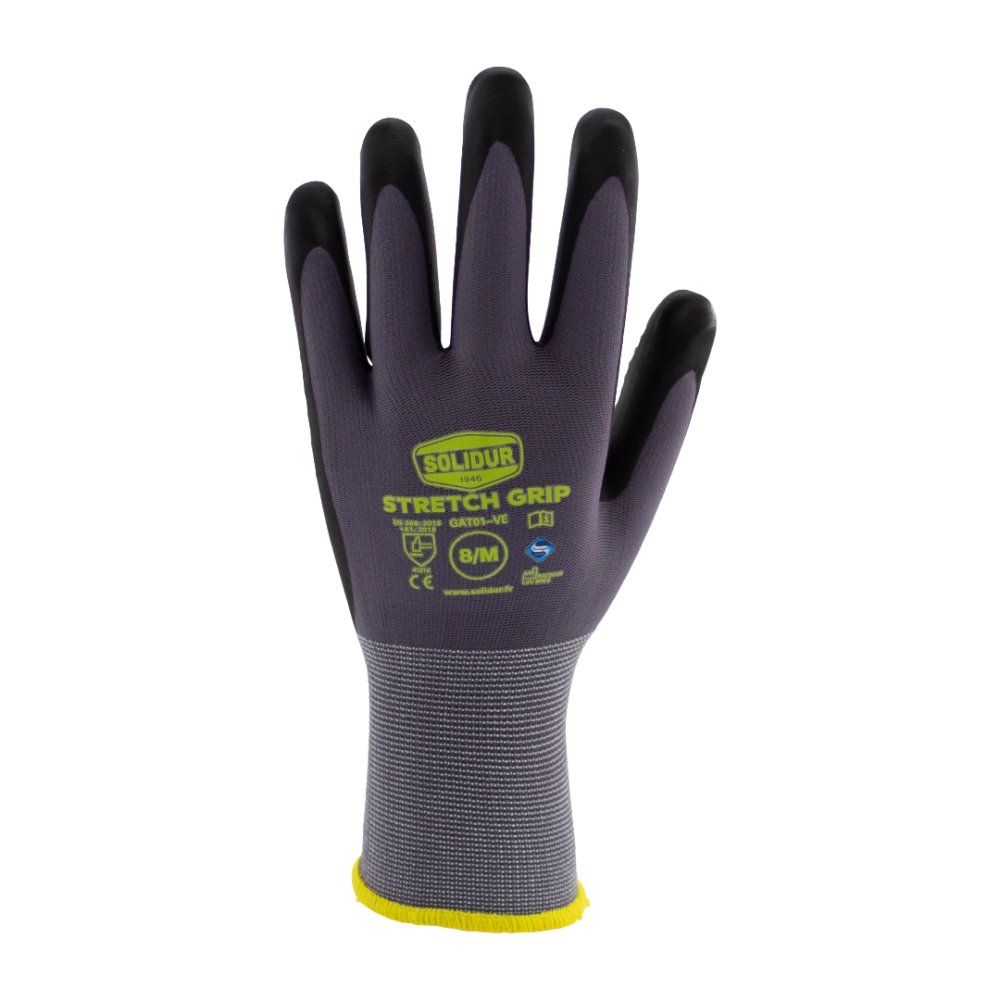 Les gants de travail SOLIDUR STRETCH GRIP allient confort, précision et résistance pour tous vos travaux de manutention. Leur tricot fin et extensible en nylon/Spandex assure une grande souplesse et une dextérité maximale, tandis que le revêtement en nitrile avec picots garantit un grip optimal, même sur des objets glissants ou légèrement huileux. Leur design ergonomique sans couture et le poignet élastique offrent un confort prolongé et protègent contre la saleté, tandis que le traitement Sanitized® Actifresh assure une hygiène durable en limitant bactéries et mauvaises odeurs. Ces gants sont donc parfaits pour les professionnels exigeants recherchant précision, sécurité et confort au quotidien.