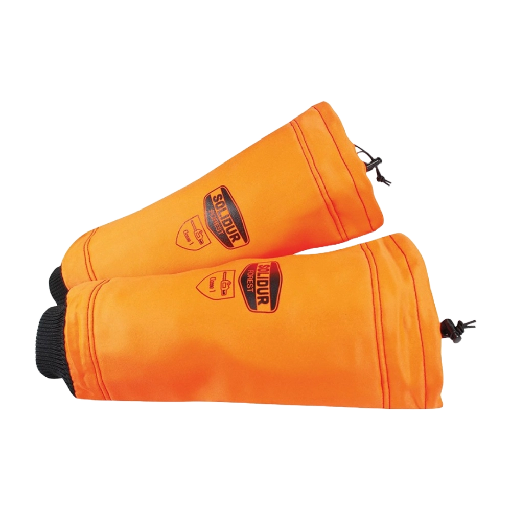 Les manchettes de protection Solidur Authentic Classe 1 sont spécialement conçues pour les professionnels utilisant des scies à chaîne. Elles couvrent intégralement les avant-bras, offrant une protection renforcée à 360° grâce à leurs neuf couches de tissu. Leur couleur orange vif garantit une visibilité optimale sur le terrain.