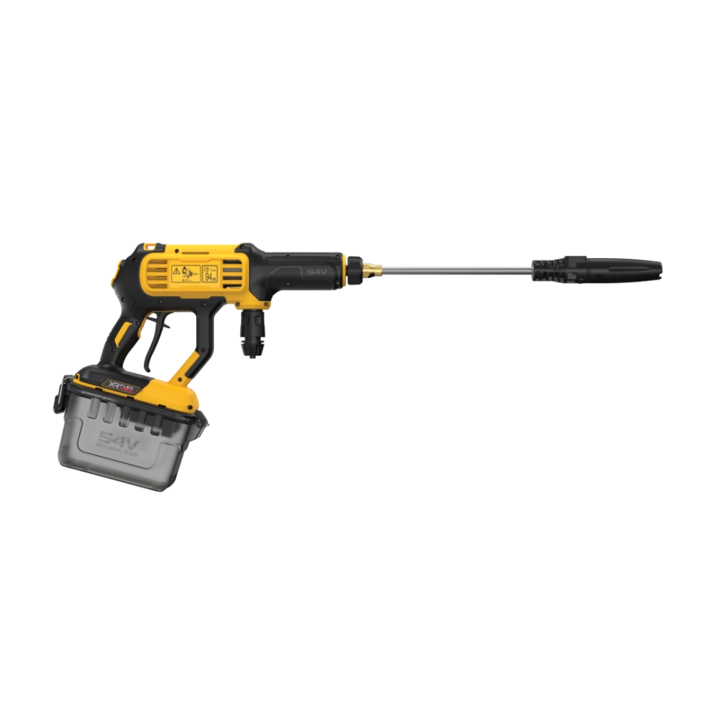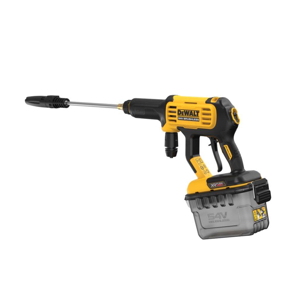 Le nettoyeur haute pression DEWALT DCMPW1000N-XJ sans fil est conçu pour offrir une vraie puissance en mobilité grâce au système 54 V XR FLEXVOLT. Son moteur brushless alimente une pompe axiale à trois pistons capable de délivrer jusqu’à 70 bar en mode haute pression, avec un débit maximal de 225 L/h. Pour les travaux plus délicats ou pour optimiser l’autonomie, un mode basse pression réglé à 45 bar est disponible. L’appareil dispose également d’une fonction d’auto-amorçage, qui lui permet de puiser l’eau directement dans un seau ou une cuve : un atout majeur pour les interventions en extérieur sans accès direct au réseau.