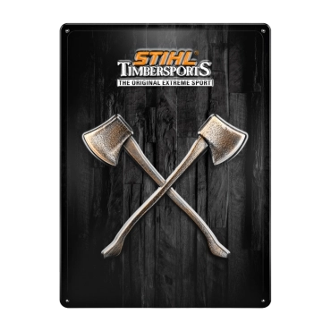 Un incontournable pour tous les nostalgiques ! Panneau STIHL TIMBERSPORTS® en métal de haute qualité, taille 30 x 40 cm avec quatre trous pour montage mural.