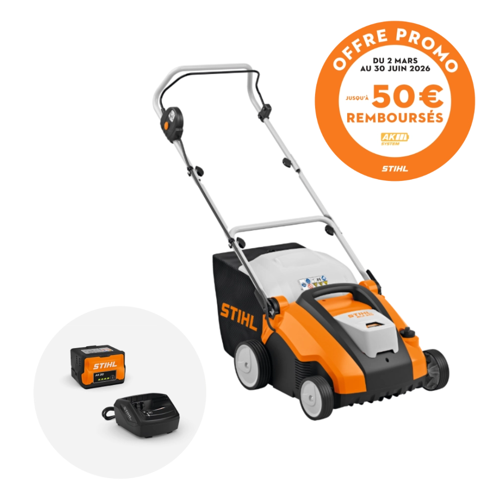 OFFRE DE REMBOURSEMENT STIHL : 30€ remboursés par STIHL pour l’achat de cette machine AK nue. 50€ remboursés par STIHL pour l’achat de cette machine en pack (avec une batterie AK et un chargeur compatible ou un set de démarrage). Offre valable du 2 mars 2026 au 30 juin 2026 dans la limite des participations restantes. Conditions complètes disponibles sur stihl-promo.fr/modalites/ak