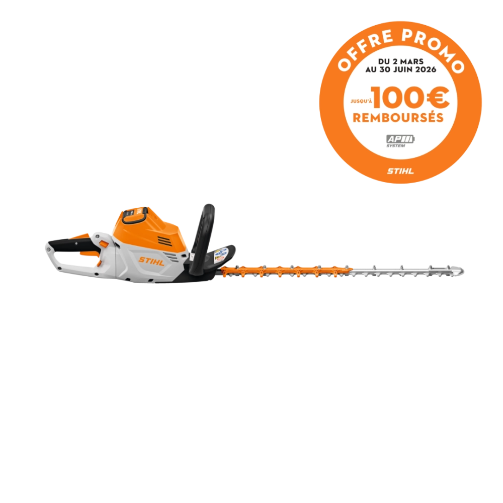 OFFRE DE REMBOURSEMENT STIHL : 50€ remboursés par STIHL pour l’achat de cette machine AP nue. 100€ remboursés par STIHL pour l’achat de cette machine en pack (avec une batterie AP et un chargeur compatible). Offre valable du 2 mars 2026 au 30 juin 2026 dans la limite de participations restantes. Conditions complètes disponibles sur stihl-promo.fr/modalites/ap