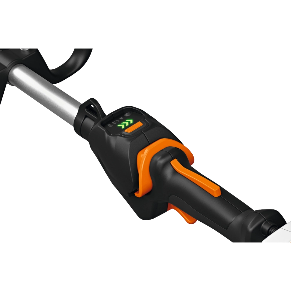L'ergonomie de l'appareil est pensée pour réduire la fatigue lors des sessions intensives, notamment grâce à un carter de transmission en magnésium qui allie légèreté extrême et robustesse professionnelle. La poignée de commande intègre un sélecteur de vitesse à trois niveaux (3 200, 3 600 et 4 000 tr/min), permettant d'adapter précisément la puissance au type de végétation pour optimiser l'autonomie de la batterie. Un crochet pour harnais intégré facilite le portage et le guidage, rendant la manipulation de cet outil de 232 cm particulièrement équilibrée et fluide.