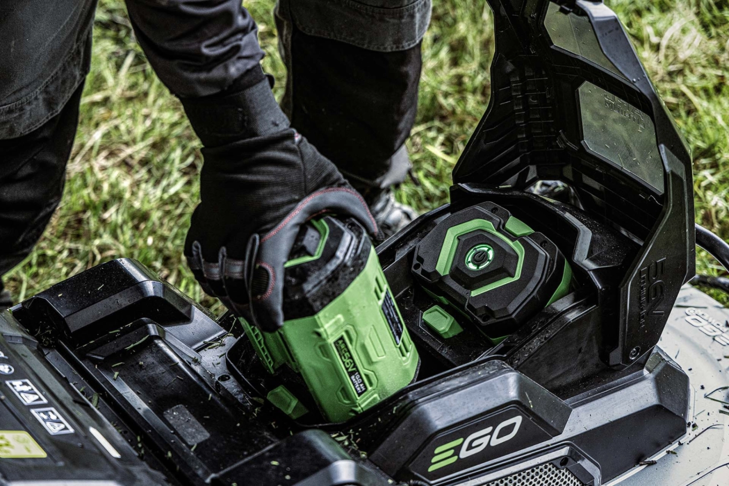 2 batteries de la capacité sélectionnée sont insérées dans le support de batterie, en fonction de la performance de surface requise de la tondeuse. La capacité maximum est de 2 fois 12 Ah, ce qui représente une réserve d'énergie pour tondre environ 4 000 m². Même la consommation et la charge des batteries, quelle que soit leur taille, sont constamment surveillées et régulées par la technologie brevetée d'EGO, appelée « Peak Power TM ». Toute batterie que vous avez dans la tondeuse peut être retirée à tout moment et utilisée pour alimenter n'importe quelle autre machine d'EGO.