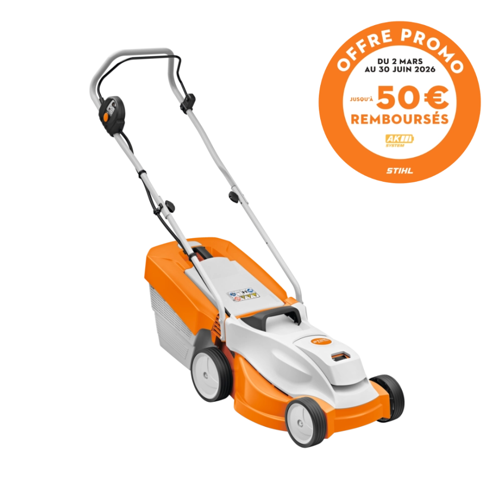 OFFRE DE REMBOURSEMENT STIHL : 50€ remboursés par STIHL pour l’achat de cette tondeuse AK nue ou en pack. Offre valable du 2 mars 2026 au 30 juin 2026 dans la limite de participations restantes. Conditions complètes disponibles sur stihl-promo.fr/modalites/tonte