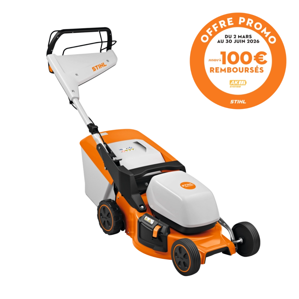 OFFRE DE REMBOURSEMENT STIHL : 100€ remboursés par STIHL pour l’achat de cette tondeuse nue ou accompagnée d’une batterie et d’un chargeur compatible ou d’un set de démarrage. Offre valable du 2 mars 2026 au 30 juin 2026 dans la limite des participations restantes. Conditions complètes disponibles sur stihl-promo.fr/modalites/tonte