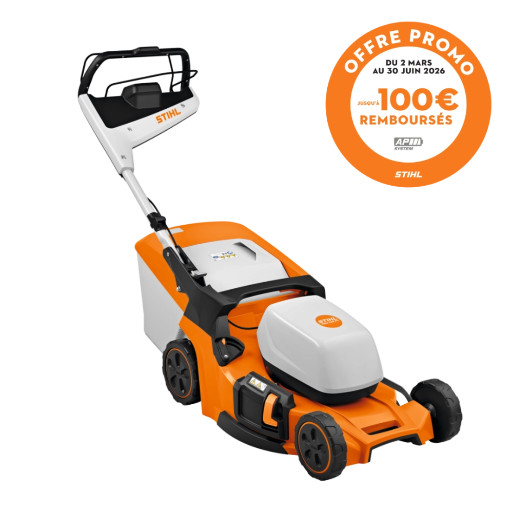 OFFRE DE REMBOURSEMENT STIHL : 100€ remboursés par STIHL pour l’achat de cette tondeuse nue ou accompagnée d’une batterie et d’un chargeur compatible ou d’un set de démarrage. Offre valable du 2 mars 2026 au 30 juin 2026 dans la limite des participations restantes. Conditions complètes disponibles sur stihl-promo.fr/modalites/tonte