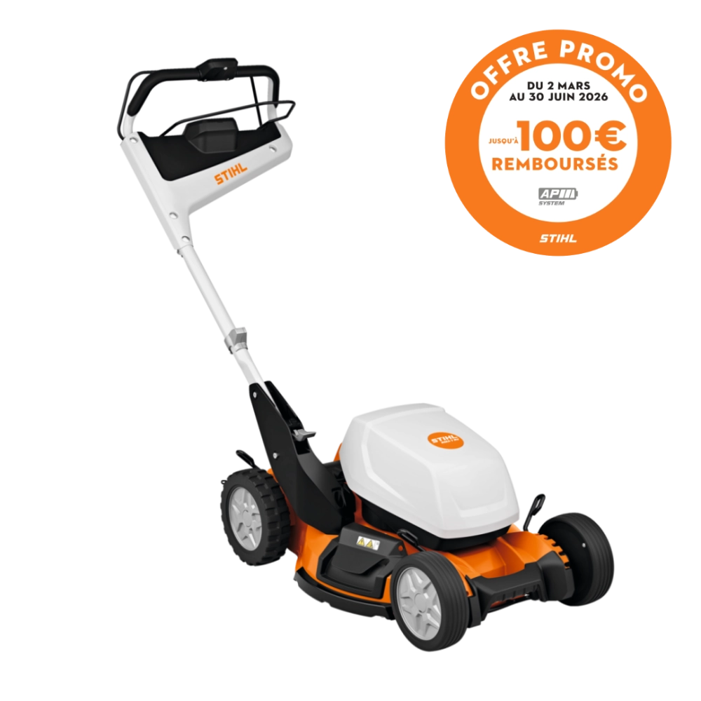 OFFRE DE REMBOURSEMENT STIHL : 100€ remboursés par STIHL pour l’achat de cette tondeuse nue ou accompagnée d’une batterie et d’un chargeur compatible ou d’un set de démarrage. Offre valable du 2 mars 2026 au 30 juin 2026 dans la limite des participations restantes. Conditions complètes disponibles sur stihl-promo.fr/modalites/tonte