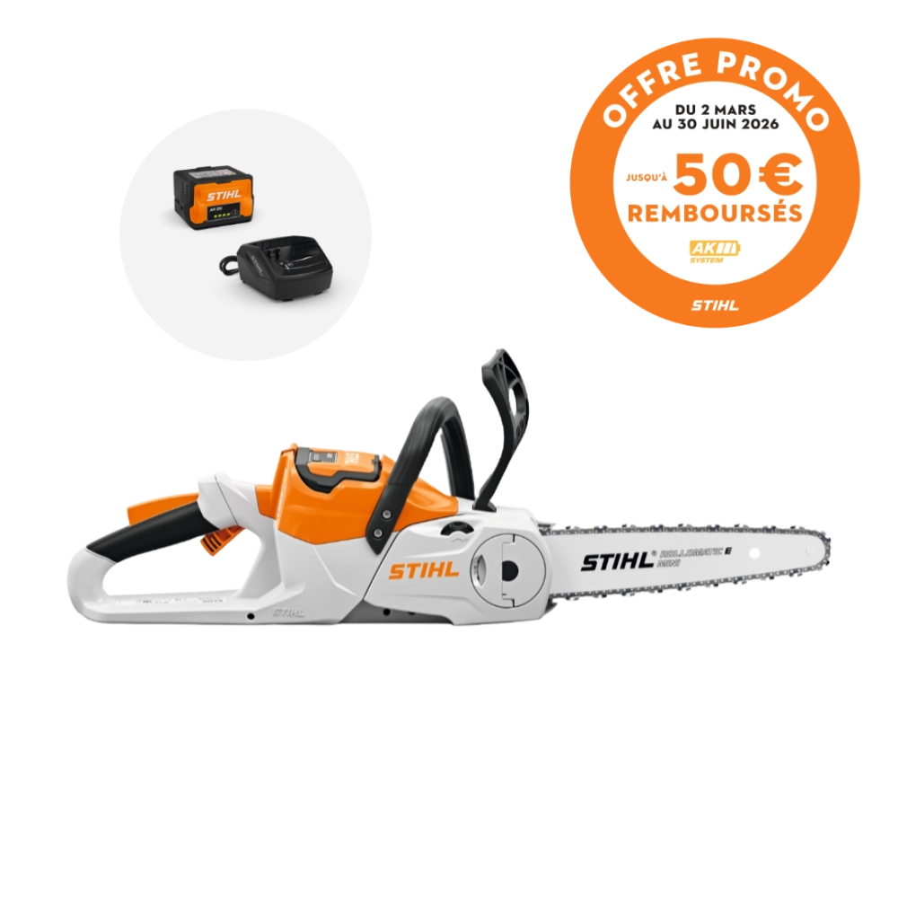 OFFRE DE REMBOURSEMENT STIHL : 30€ remboursés par STIHL pour l’achat de cette machine AK nue. 50€ remboursés par STIHL pour l’achat de cette machine en pack (avec une batterie AK et un chargeur compatible ou un set de démarrage). Offre valable du 2 mars 2026 au 30 juin 2026 dans la limite des participations restantes. Conditions complètes disponibles sur stihl-promo.fr/modalites/ak